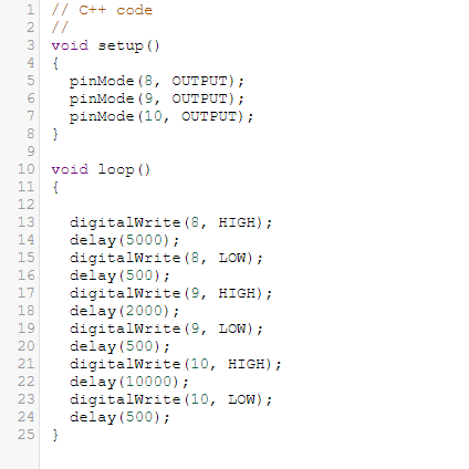 Implementamos a lógica para acender e apagar os LEDs de forma sequencial no void loop(),