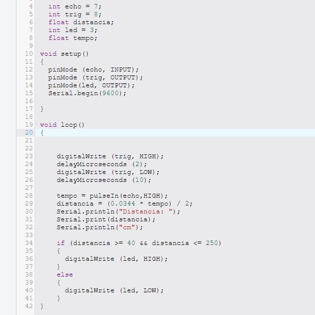 de 40 cm a 250 cm, passando pela estrutura IF/ELSE, usando o comando digitalWrite() o led será ativado.