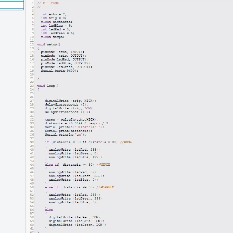 distância é calculado e impresso no monitor serial. Dependendo da distância, o LED RGB é configurado